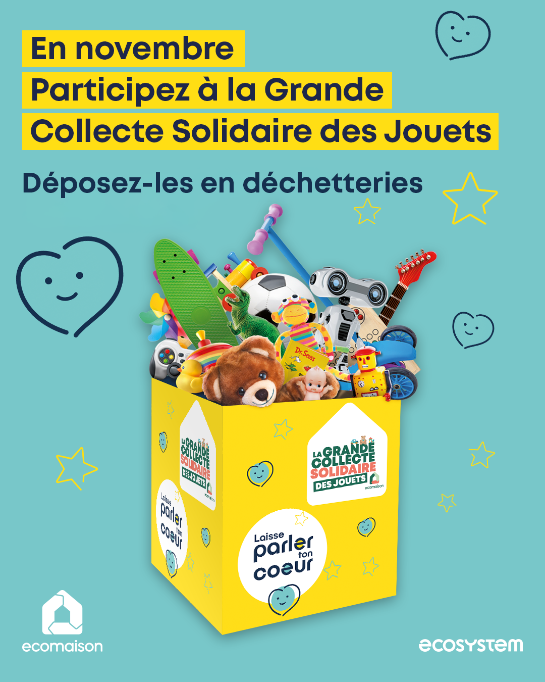 Donner un jouet inutilisé, plutôt que de le jeter, prolonge sa durée de vie, participe à la réduction des déchets et permet de faire un geste solidaire à l’approche des fêtes de fin d’année. Jouets électriques, électroniques, en bois, de construction, de société, peluches, poupées… Tous sont acceptés complets et en bon état !